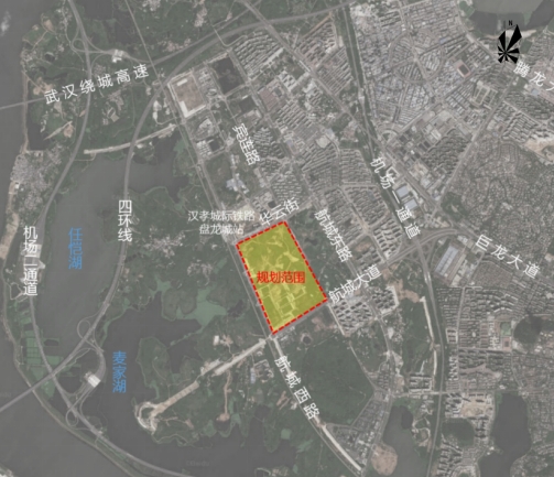 以机场一通道、机场二通道、府澴河、绕城高速围合区域为研究范围,用地面积约19.57平方公里。