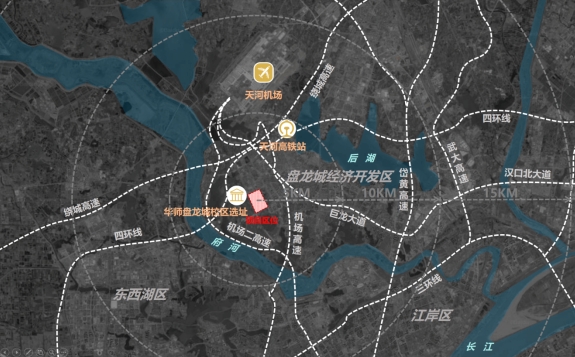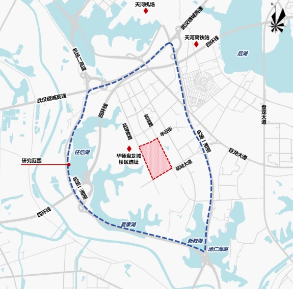 First, fully consider the connection with major surrounding functions and projects, including establishing spatial dialogue with Tianhe International Airport, Wuhan Tianhe Station of the Yangtze River High-speed Railway, Panlongcheng Campus of Central China Normal University, etc. For the research scope, put forward planning strategies such as transportation system optimization, blue-green network construction, and air-rail intermodal transportation organization.